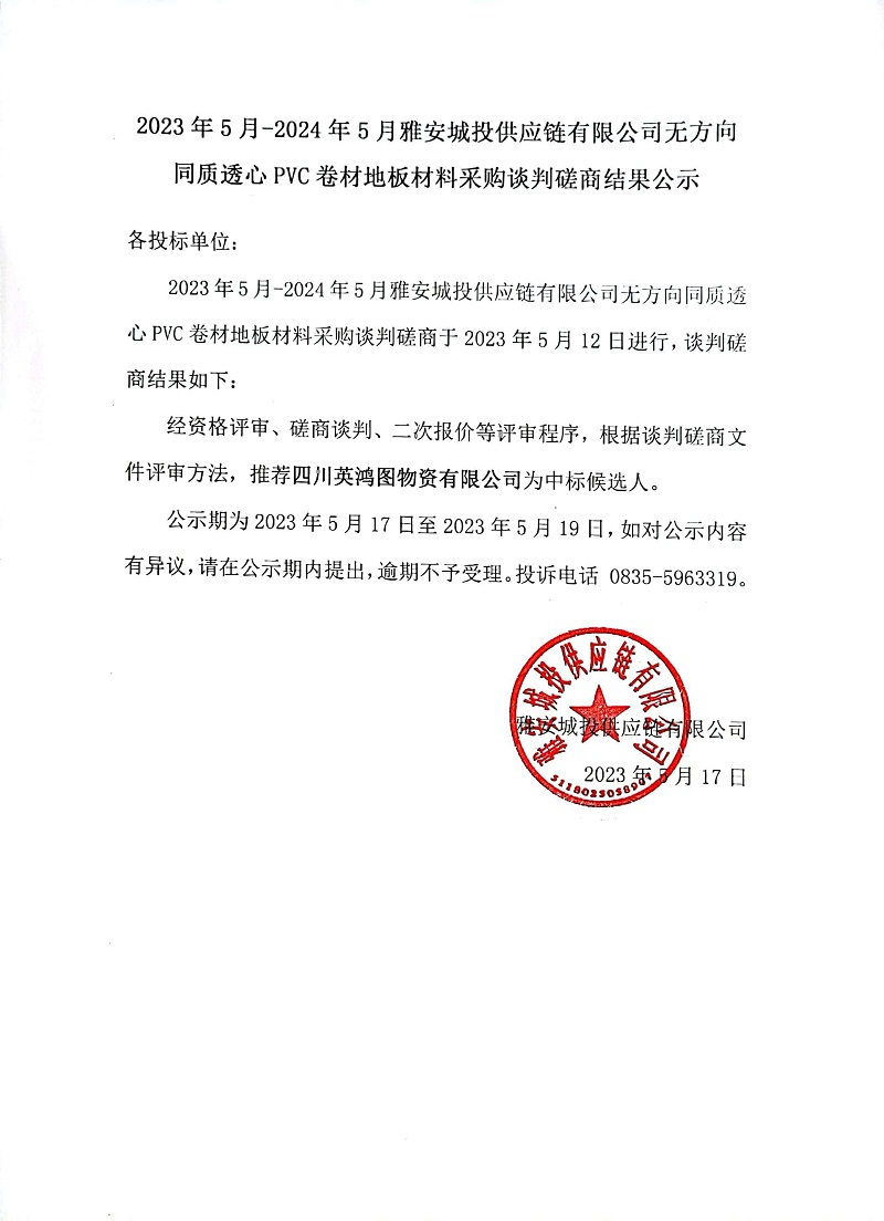2023年5月-2024年5月雅安城投供應鏈有限公司無方向同質(zhì)透心PVC卷材地板材料采購談判磋商結(jié)果公示