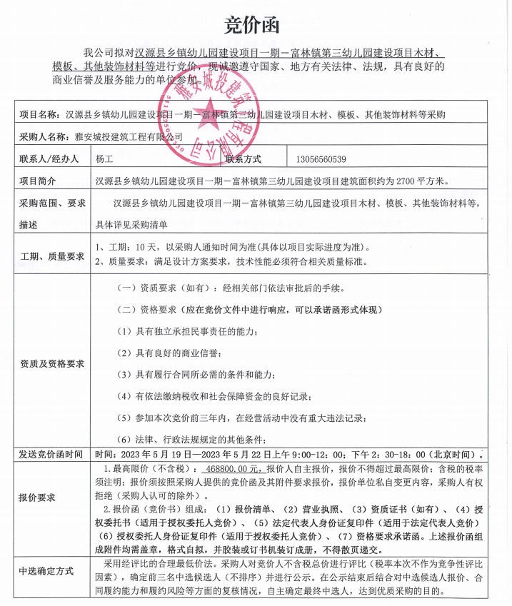 漢源縣鄉(xiāng)鎮(zhèn)幼兒園建設(shè)項(xiàng)目一期一富林鎮(zhèn)第三幼兒園建設(shè)項(xiàng)目木材、模板、其他裝飾材料等采購競價(jià)公告