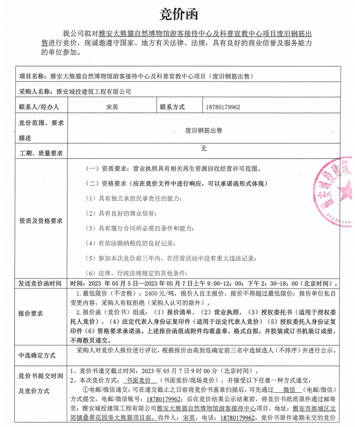 雅安大熊貓自然博物館游客接待中心及科普宣教中心項(xiàng)目廢舊鋼筋出售競價(jià)公告