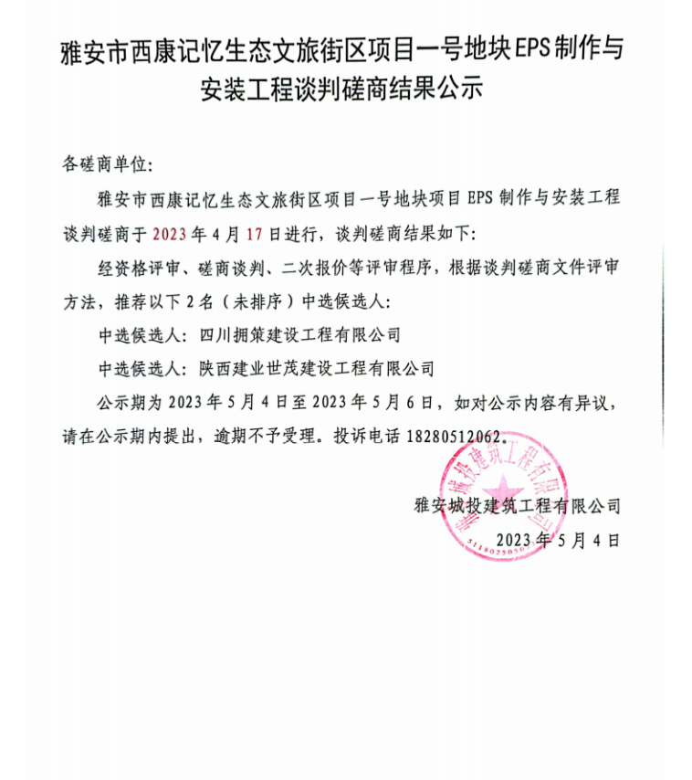 雅安市西康記憶生態(tài)文旅雅安市西康記憶生態(tài)文旅街區(qū)項目一號地塊EPS制作與安裝工程談判磋商結果公示
