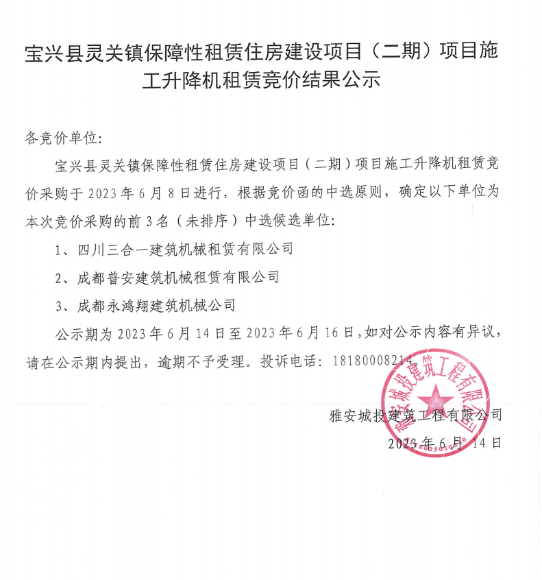 寶興縣靈關(guān)鎮(zhèn)保障性租賃住房建設(shè)項(xiàng)目(二期)項(xiàng)目施工升降機(jī)租賃競價(jià)結(jié)果公示