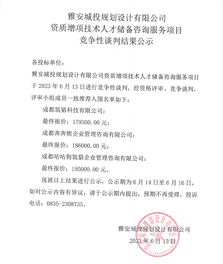 雅安城投規(guī)劃設(shè)計(jì)有限公司資質(zhì)增項(xiàng)技術(shù)人才儲(chǔ)備咨詢服務(wù)項(xiàng)目競(jìng)爭(zhēng)性談判結(jié)果公示
