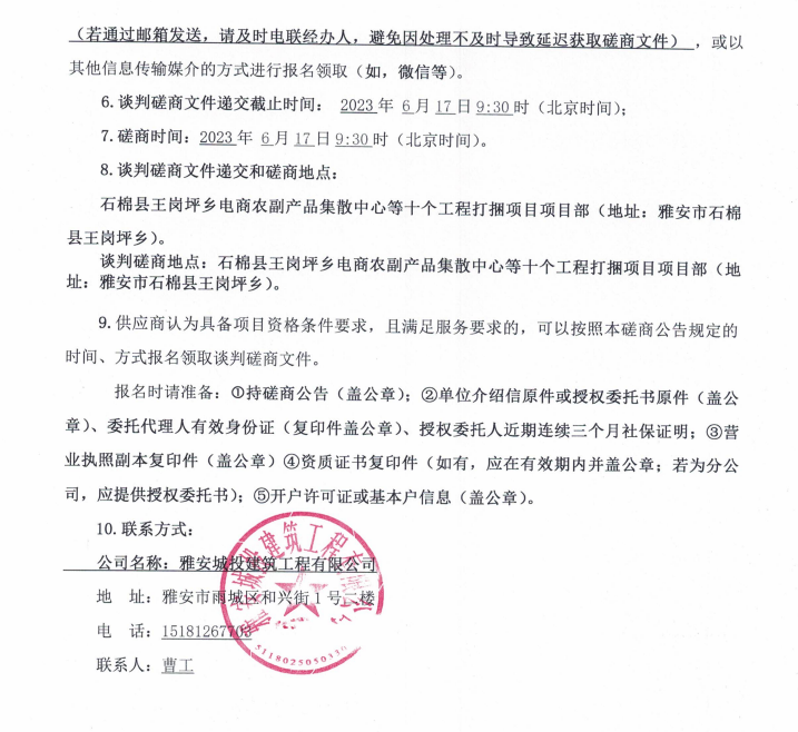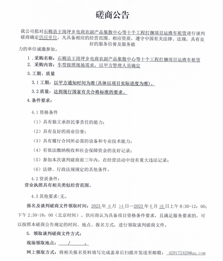 石棉縣王崗坪鄉(xiāng)電商農副產品集散中心等十個工程打捆項目運渣車租賃談判磋商公告