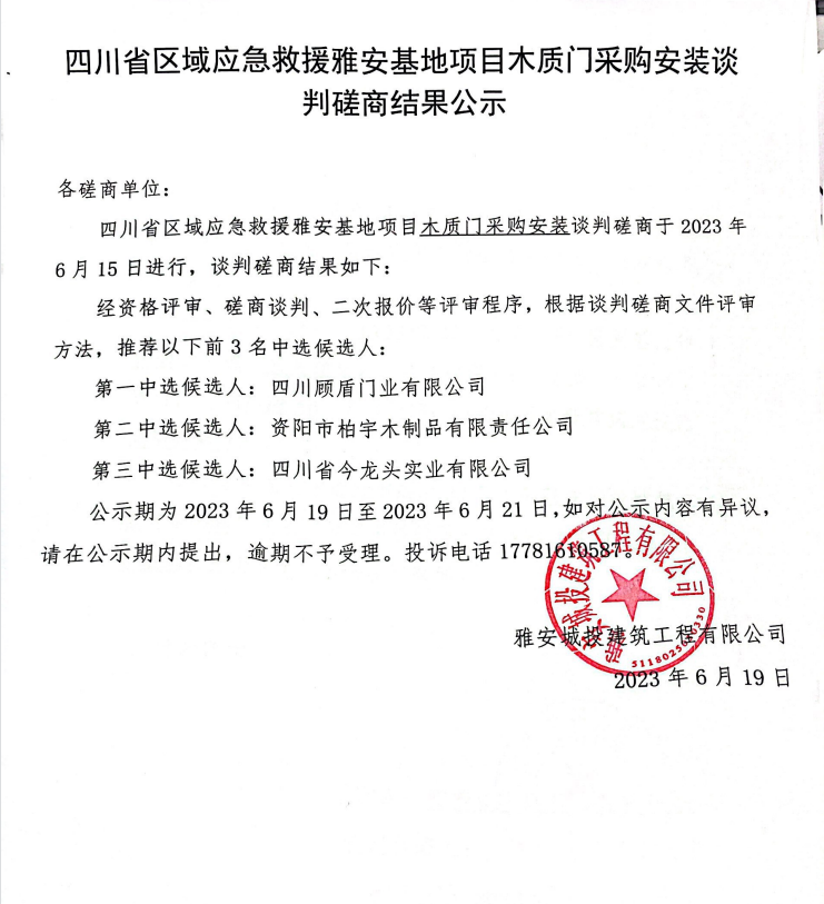 四川省區(qū)域應(yīng)急救援雅安基地項(xiàng)目木質(zhì)門(mén)采購(gòu)安裝談判磋商結(jié)果公示
