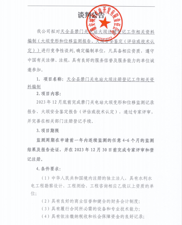天全縣禁門關電站大壩注冊登記工作相關資料編制(大壩變形和位移監(jiān)測報告、大壩安全鑒定(評估或技術認定))談判公告