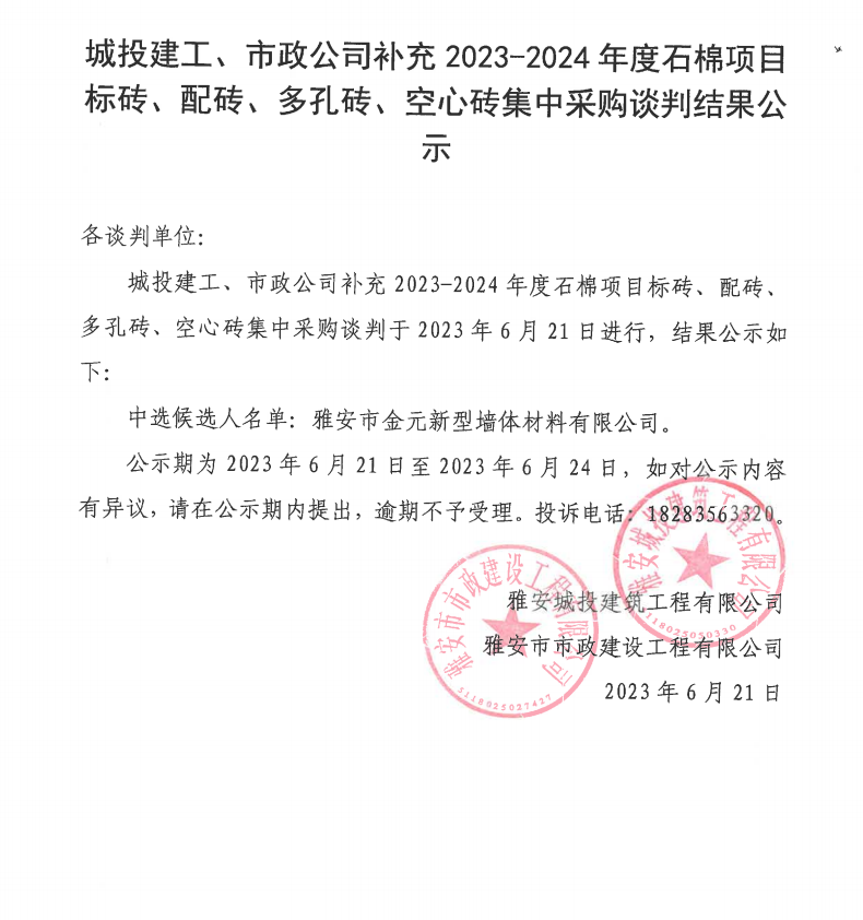 城投建工、市政公司補充2023-2024年度石棉項目標磚、配磚、多孔磚、空心磚集中采購談判結果公示