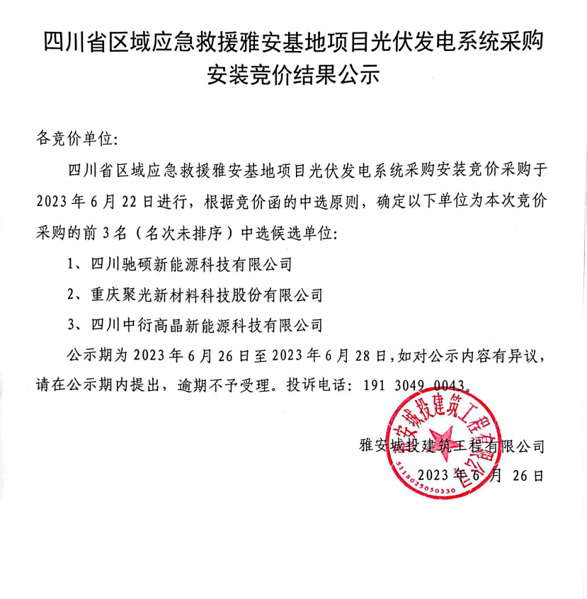 四川省區(qū)域應急救援雅安基地項目光伏發(fā)電系統(tǒng)采購安裝競價結(jié)果公示