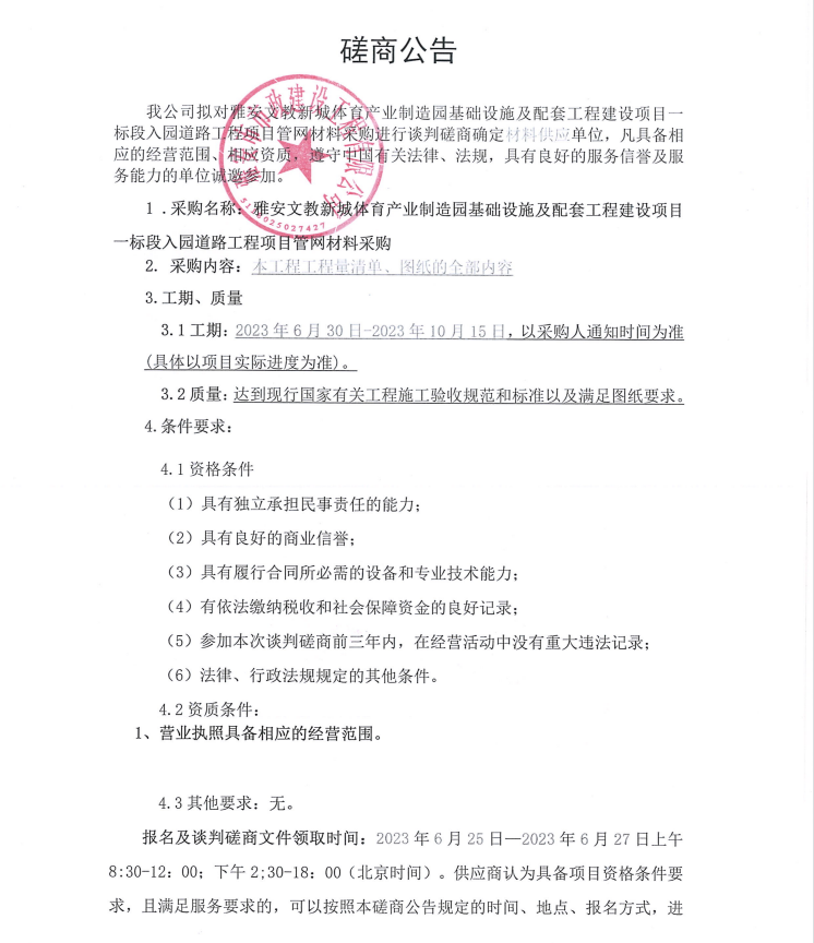 雅安文教新城體育產(chǎn)業(yè)制造園基礎(chǔ)設(shè)施及配套工程建設(shè)項(xiàng)目一標(biāo)段入園道路工程項(xiàng)目管網(wǎng)材料采購談判磋商公告
