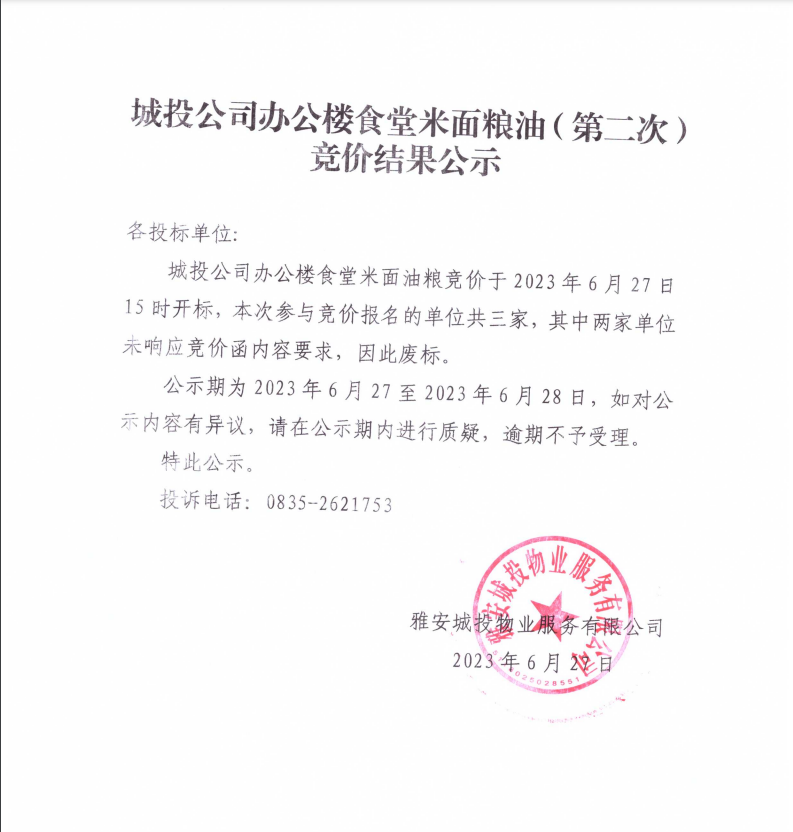 城投公司辦公樓食堂米面糧油(第二次)競價(jià)結(jié)果公示
