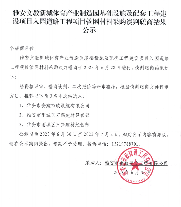 雅安文教新城體育產(chǎn)業(yè)制造園基礎(chǔ)設(shè)施及配套工程建設(shè)項(xiàng)目入園道路工程項(xiàng)目管網(wǎng)材料采購(gòu)談判磋商結(jié)果公示