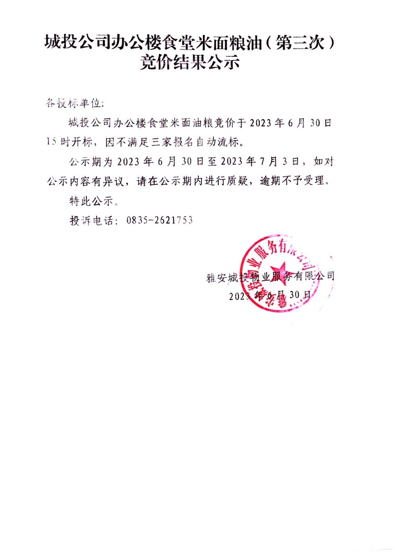 城投公司辦公樓食堂米面糧油(第三次)競價結果公示