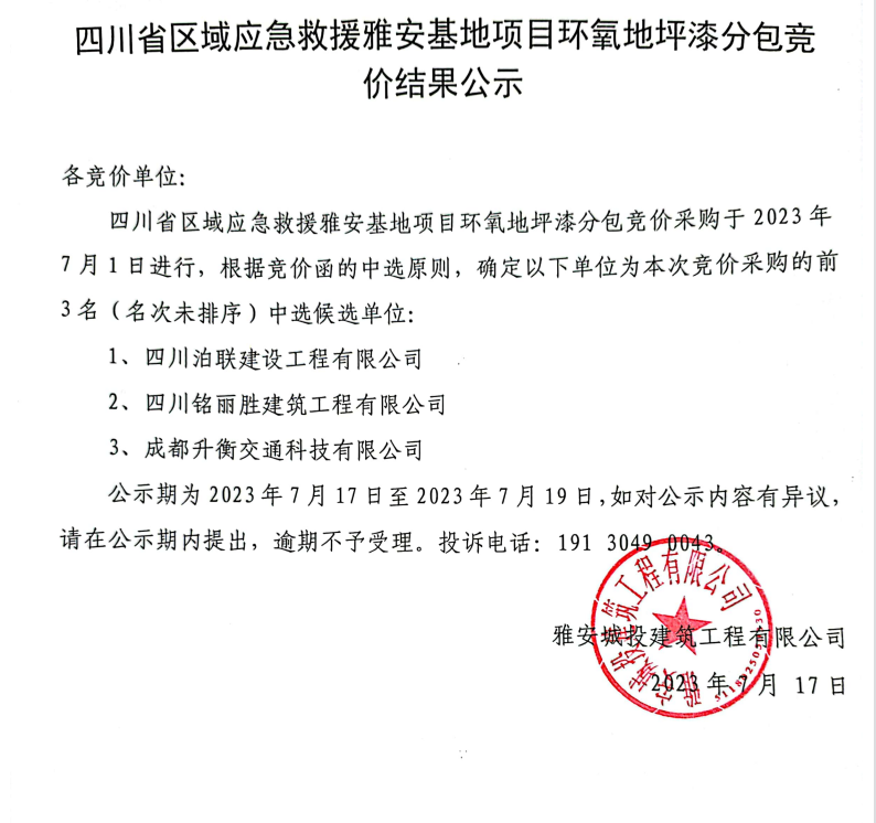 四川省區(qū)域應(yīng)急救援雅安基地項(xiàng)目環(huán)氧地坪漆分包競價(jià)結(jié)果公示