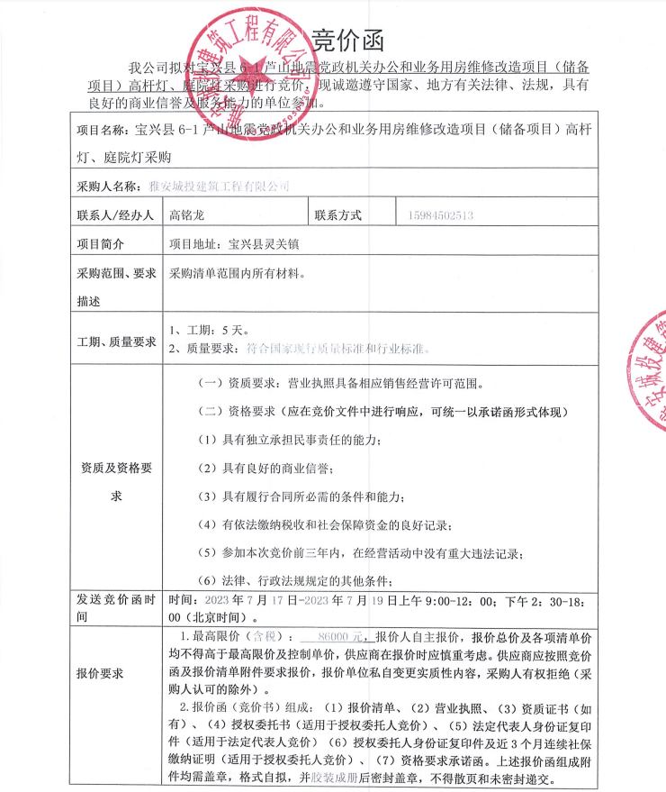 寶興縣6-1蘆山地震黨政機關辦公和業(yè)務用房維修改造項目(儲備項目)高桿燈、庭院燈采購競價公告