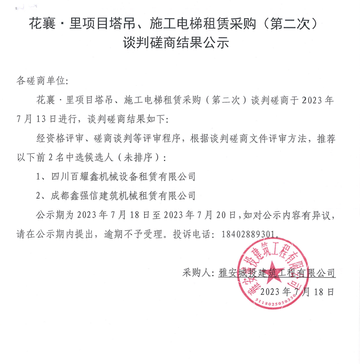 花襄·里項(xiàng)目塔吊、施工電梯租賃采購(gòu)(第二次)談判磋商結(jié)果公示