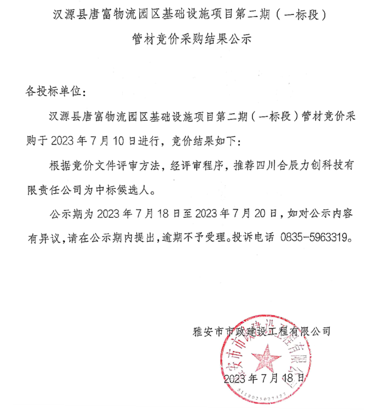 漢源縣唐富物流園區(qū)基礎設施項目二期(一標段)管材競價采購結(jié)果公示