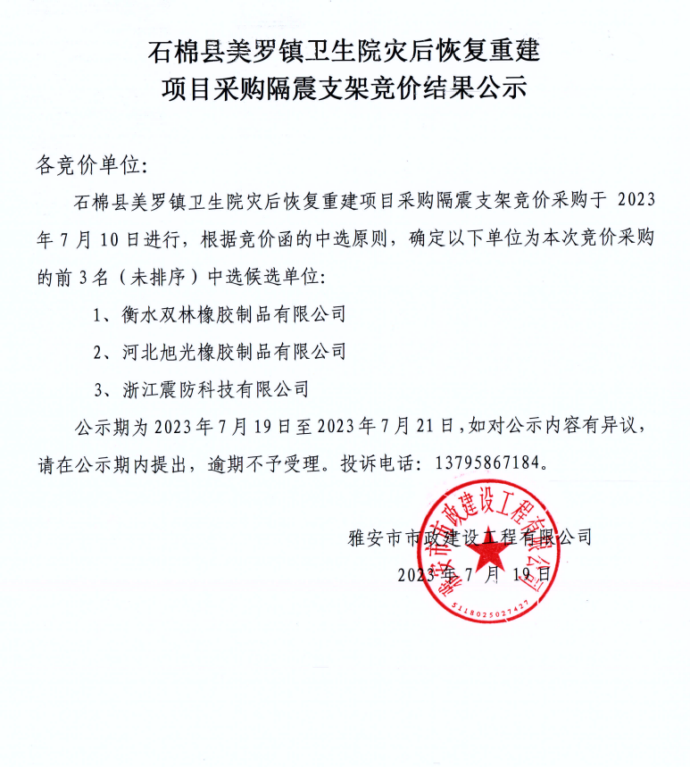 石棉縣美羅鎮(zhèn)衛(wèi)生院災(zāi)后恢復(fù)重建項目采購隔震支架競價結(jié)果公示