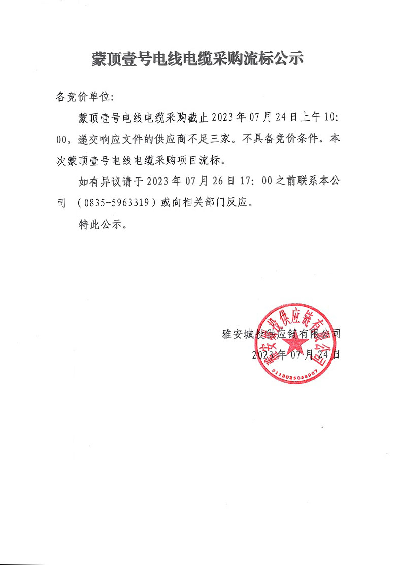 蒙頂壹號(hào)電線電纜采購流標(biāo)公示