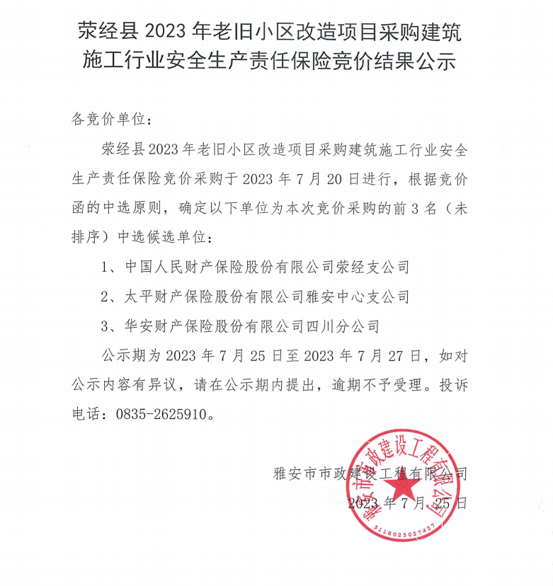 滎經縣2023年老舊小區(qū)改造項目采購建筑施工行業(yè)安全生產責任保險競價結果公示
