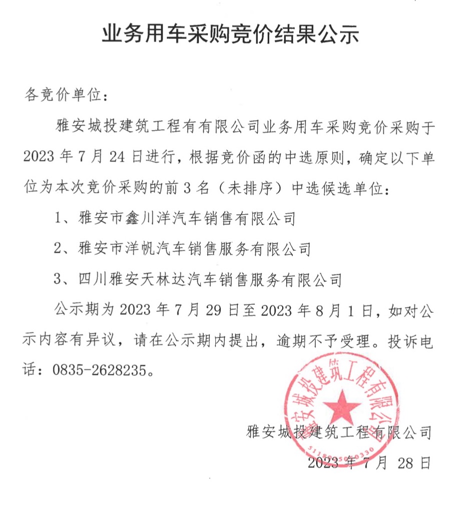 業(yè)務(wù)用車(chē)采購(gòu)競(jìng)價(jià)結(jié)果公示