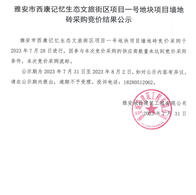 雅安市西康記憶生態(tài)文旅街區(qū)項(xiàng)目一號地塊項(xiàng)目墻地磚采購競價(jià)結(jié)果公示
