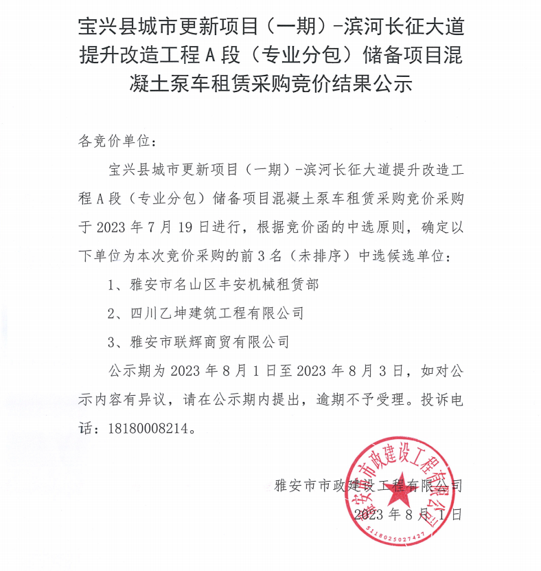 寶興縣城市更新項目(一期)-濱河長征大道提升改造工程A段(專業(yè)分包)儲備項目混凝土泵車租賃采購競價結果公示