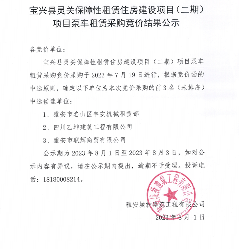 寶興縣靈關(guān)保障性租賃住房建設項目(二期)項目泵車租賃采購競價結(jié)果公示