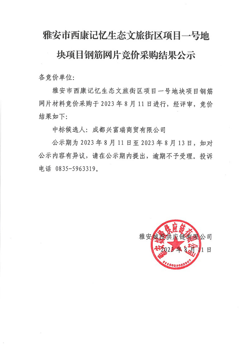 雅安市西康記憶生態(tài)文旅街區(qū)項(xiàng)目一號(hào)地塊項(xiàng)目鋼筋網(wǎng)片競(jìng)價(jià)采購結(jié)果公示