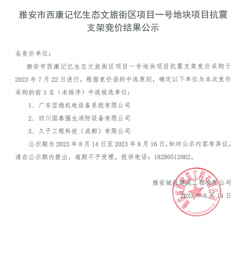 雅安市西康記憶生態(tài)文旅街區(qū)項目一號地塊項目抗震支架競價結(jié)果公示