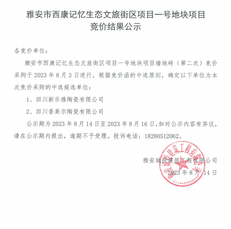 雅安市西康記憶生態(tài)文旅街區(qū)項(xiàng)目一號(hào)地塊項(xiàng)目墻地磚(第二次)競價(jià)結(jié)果公示