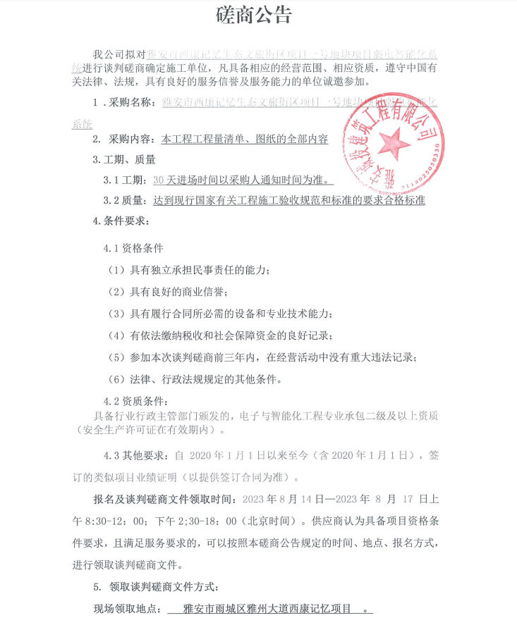 雅安市西康記憶生態(tài)文旅街區(qū)項目一號地塊項目弱電智能化系統(tǒng)談判磋商公告