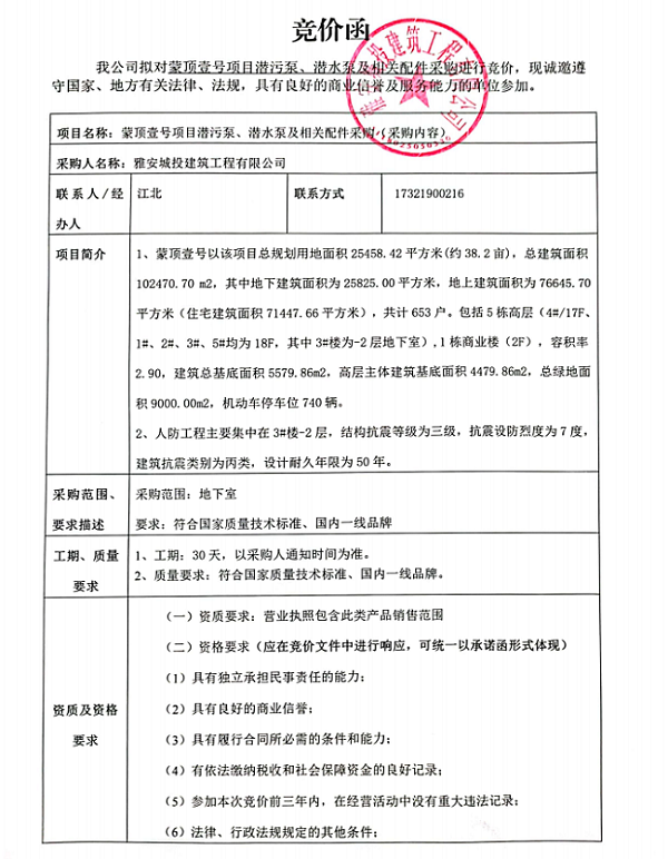 蒙頂壹號項(xiàng)目潛污泵、潛水泵及相關(guān)配件采購競價公告