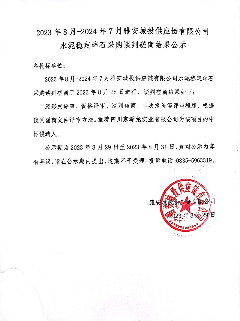 2023年8月-2024年7月雅安城投供應(yīng)鏈有限公司水泥穩(wěn)定碎石采購(gòu)談判磋商結(jié)果公示