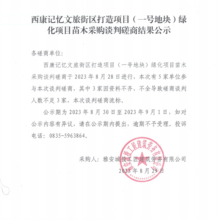 西康記憶文旅街區(qū)打造項(xiàng)目(一號(hào)地塊)綠化項(xiàng)目苗木采購談判磋商結(jié)果公示