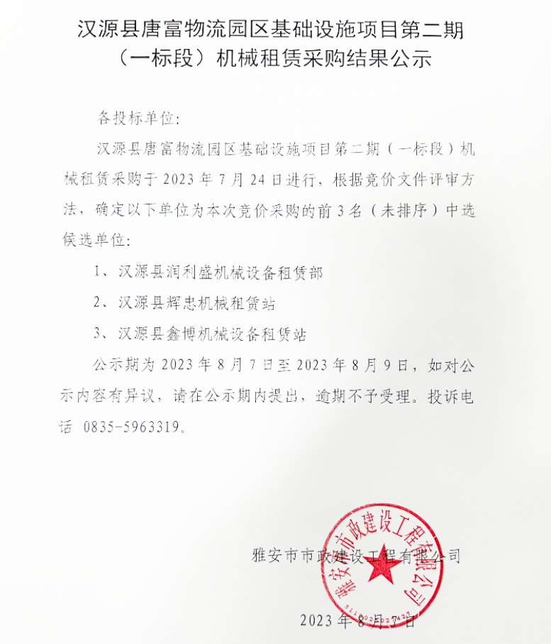 漢源縣唐富物流園區(qū)基礎設施項目第二期(一標段)機械租賃采購結果公示
