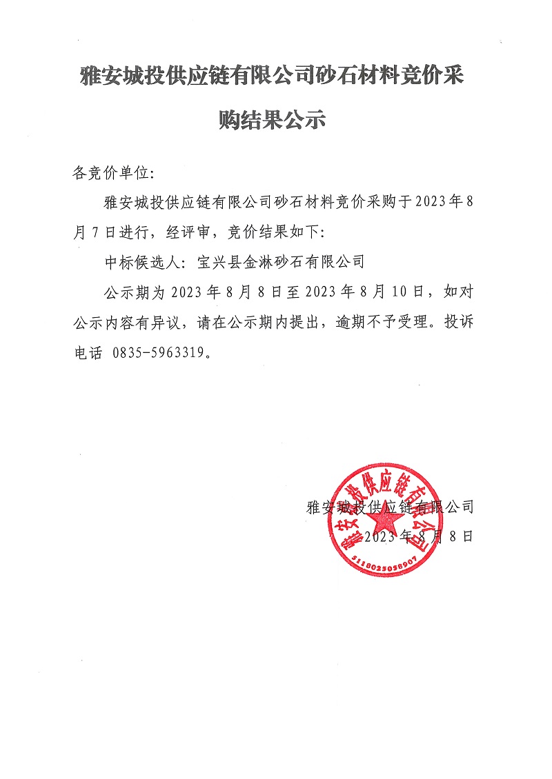 雅安城投供應(yīng)鏈有限公司砂石材料競(jìng)價(jià)采購結(jié)果公示