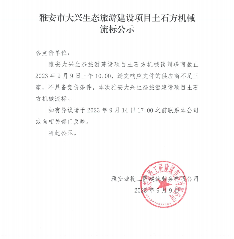 雅安市大興生態(tài)旅游建設(shè)項目土石方機械流標(biāo)公示