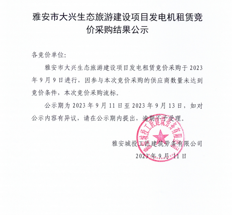 雅安市大興生態(tài)旅游建設(shè)項(xiàng)目發(fā)電機(jī)租賃競(jìng)價(jià)采購(gòu)結(jié)果公示