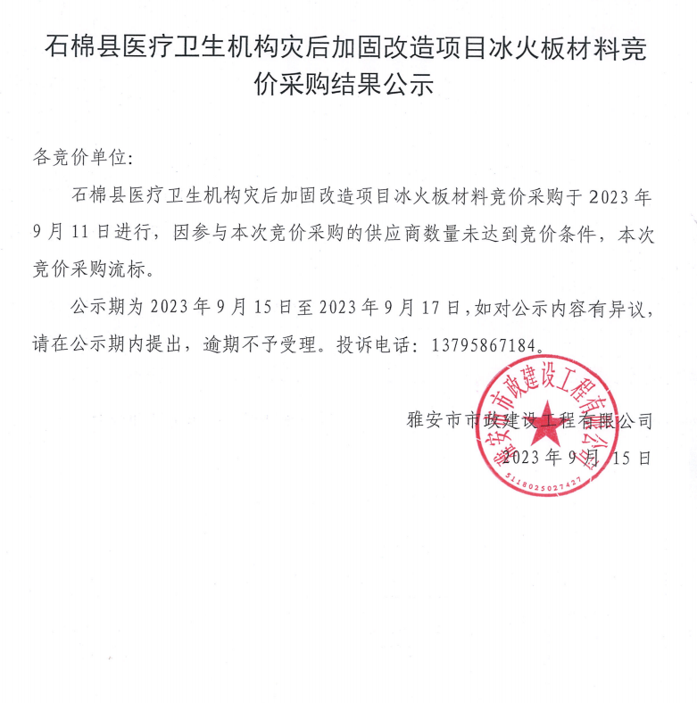 石棉縣醫(yī)療衛(wèi)生機(jī)構(gòu)災(zāi)后加固改造項(xiàng)目冰火板材料競(jìng)價(jià)采購(gòu)結(jié)果公示