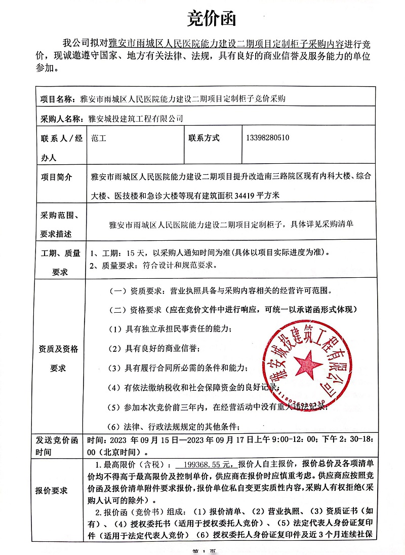 雅安市雨城區(qū)人民醫(yī)院能力建設(shè)二期項(xiàng)目定制柜子采購競價(jià)公告
