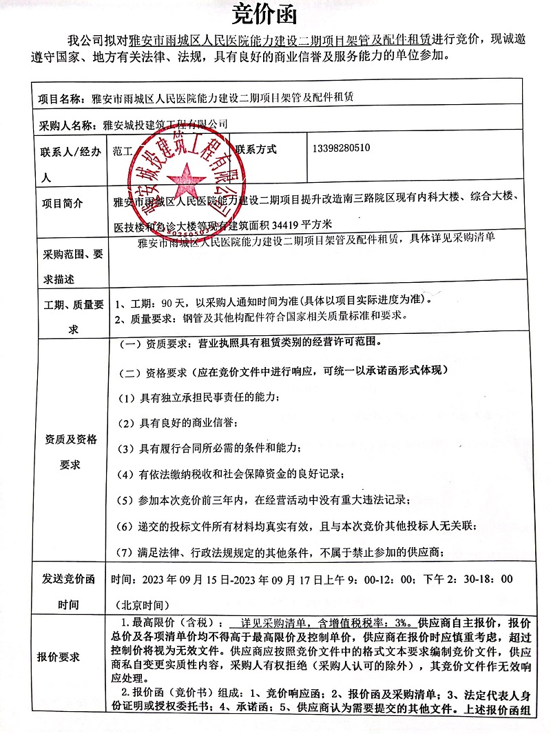 雅安市雨城區(qū)人民醫(yī)院能力建設二期項目架管及配件租賃競價公告