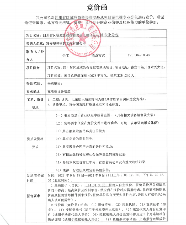 四川省區(qū)域應(yīng)急救援雅安基地項(xiàng)目充電樁專(zhuān)業(yè)分包競(jìng)價(jià)公告
