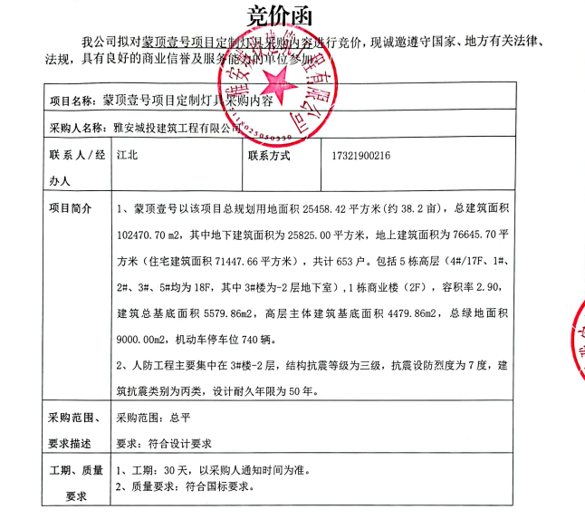 蒙頂壹號項目定制燈具采購競價公告