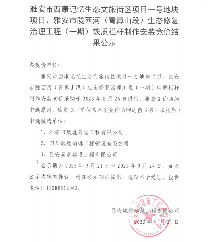 雅安市西康記憶生態(tài)文旅街區(qū)項目一號地塊項目、雅安市隴西河(青鼻山段)生態(tài)修復治理工程(一期)鐵質(zhì)欄桿制作安裝競價結(jié)果公示