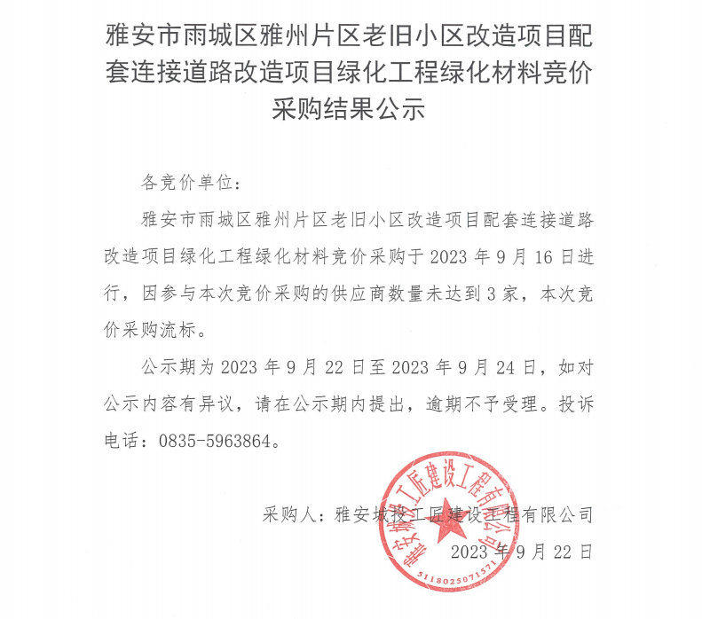 雅安市雨城區(qū)雅州片區(qū)老舊小區(qū)改造項(xiàng)目配套連接道路改造項(xiàng)目綠化工程綠化材料競價(jià)采購結(jié)果公示
