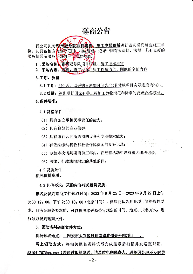雅州壹號項目塔機、施工電梯租賃磋商公告