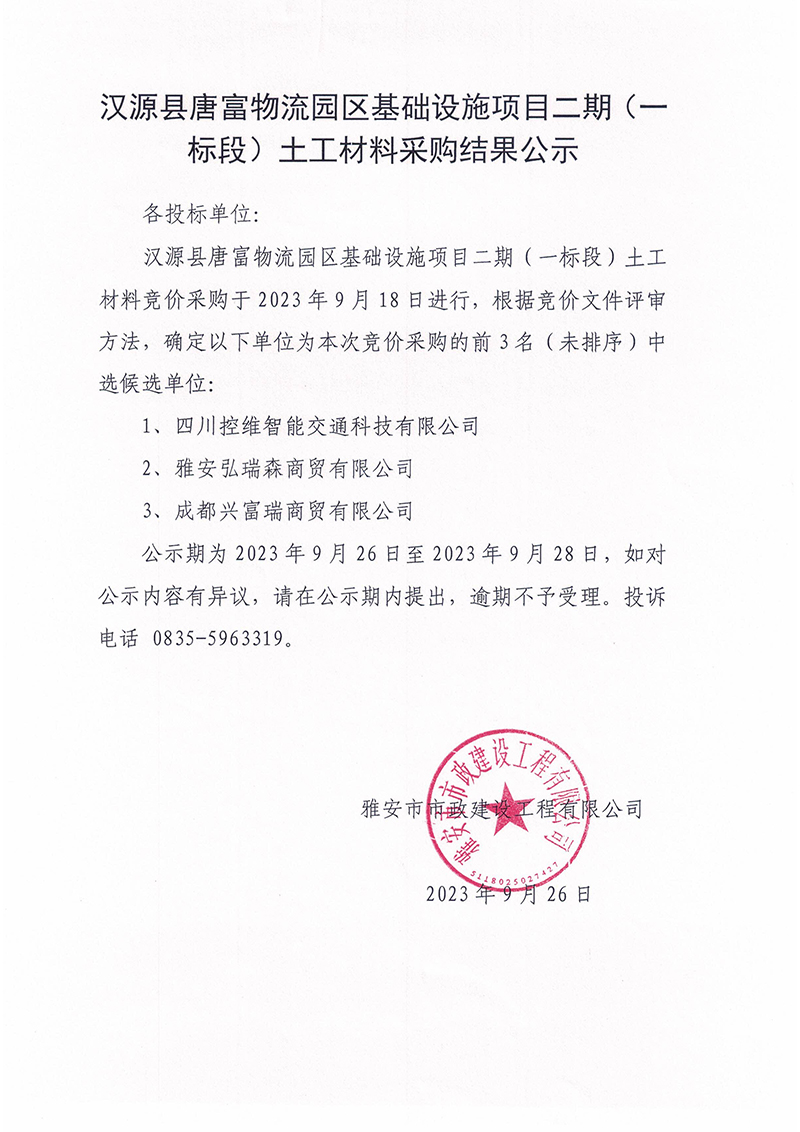 漢源縣唐富物流園區(qū)基礎設施項目二期(一標段)土工材料采購結果公示
