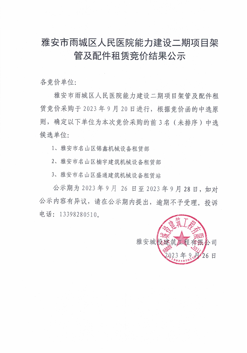 雅安市雨城區(qū)人民醫(yī)院能力建設(shè)二期項(xiàng)目架管及配件租賃競價(jià)結(jié)果公示