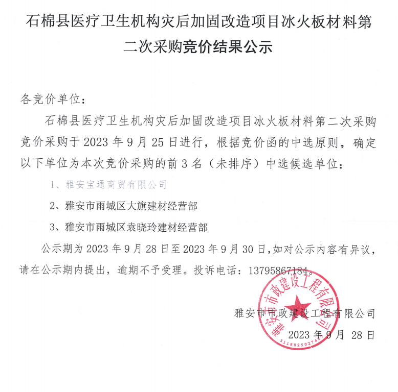 石棉縣醫(yī)療衛(wèi)生機(jī)構(gòu)災(zāi)后加固改造項目冰火板材料第二次采購競價結(jié)果公示