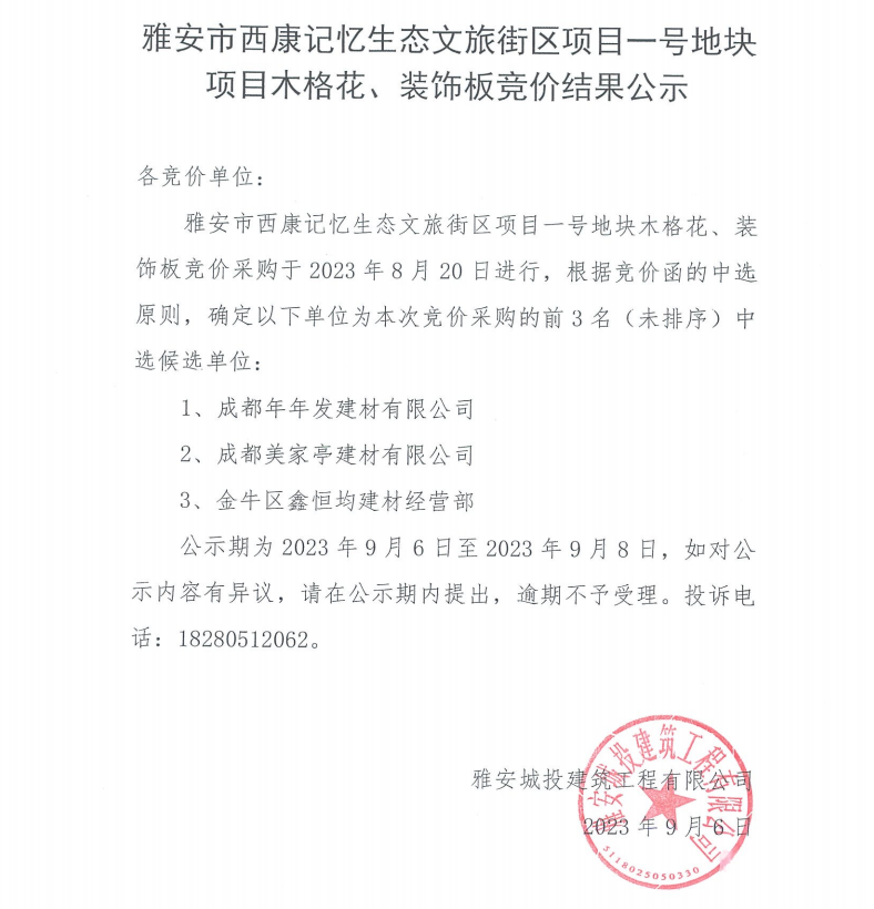 雅安市西康記憶生態(tài)文旅街區(qū)項目一號地塊項目木格花、裝飾板競價結果公示