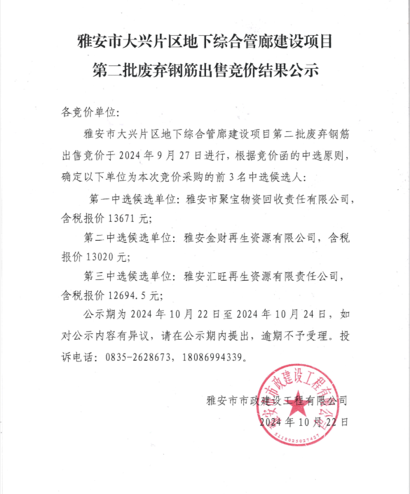 雅安市大興片區(qū)地下綜合管廊建設(shè)項(xiàng)目第二批廢棄鋼筋出售競價(jià)結(jié)果公示